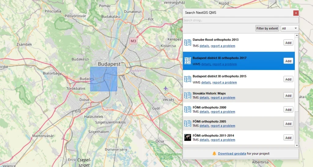 Behind the plugin is the QMS catalog, a public database of geospatial services available at qms.nextgis.com.